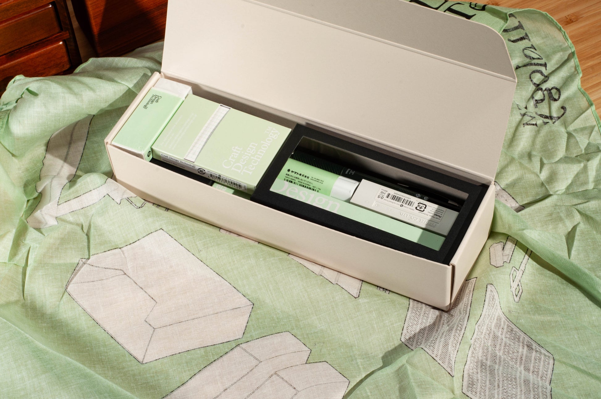 CDT Stationery Set S Grey A beautiful collection of CDT’s stationery that includes - Mechanical Pencil 038W / EnerGel knock Black / 0.5mm Pencil Lead / Glue Stick -Pale green- / Eraser / Adhesive Notes -Small-. Packaged in a CDT original gift box and also wrapped in a cotton 100% handkerchief which printed CDT stationery illustration. No matter the occasion, no matter the connection, this stationery gift set must be always come in handy.