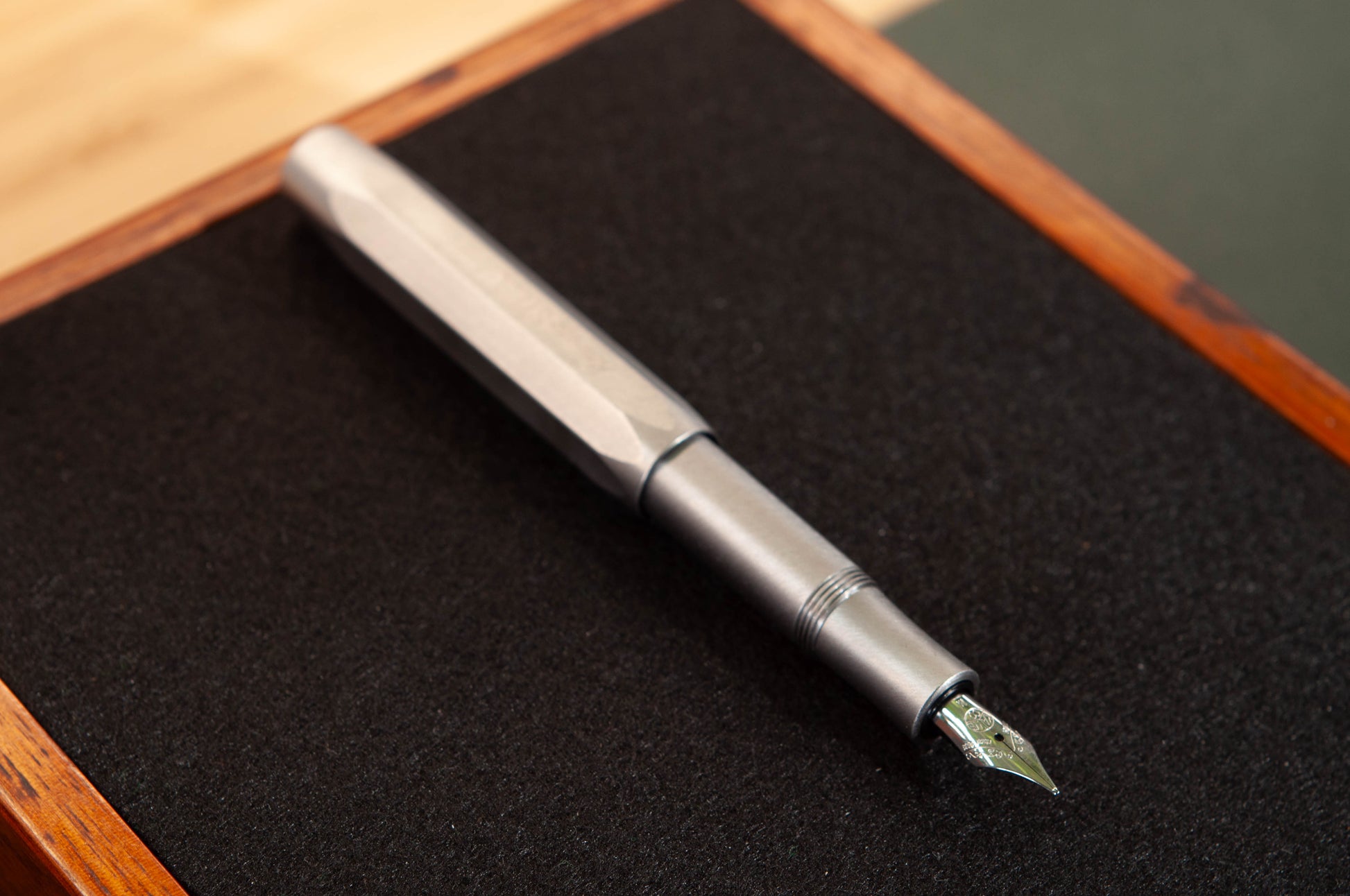 A solid stainless steel fountain pen with a brushed finish. Heavier build means smoother, low-effort writing. Pocket-sized, posts to full length. Durable, balanced, and built for everyday writing that feels a bit more serious.