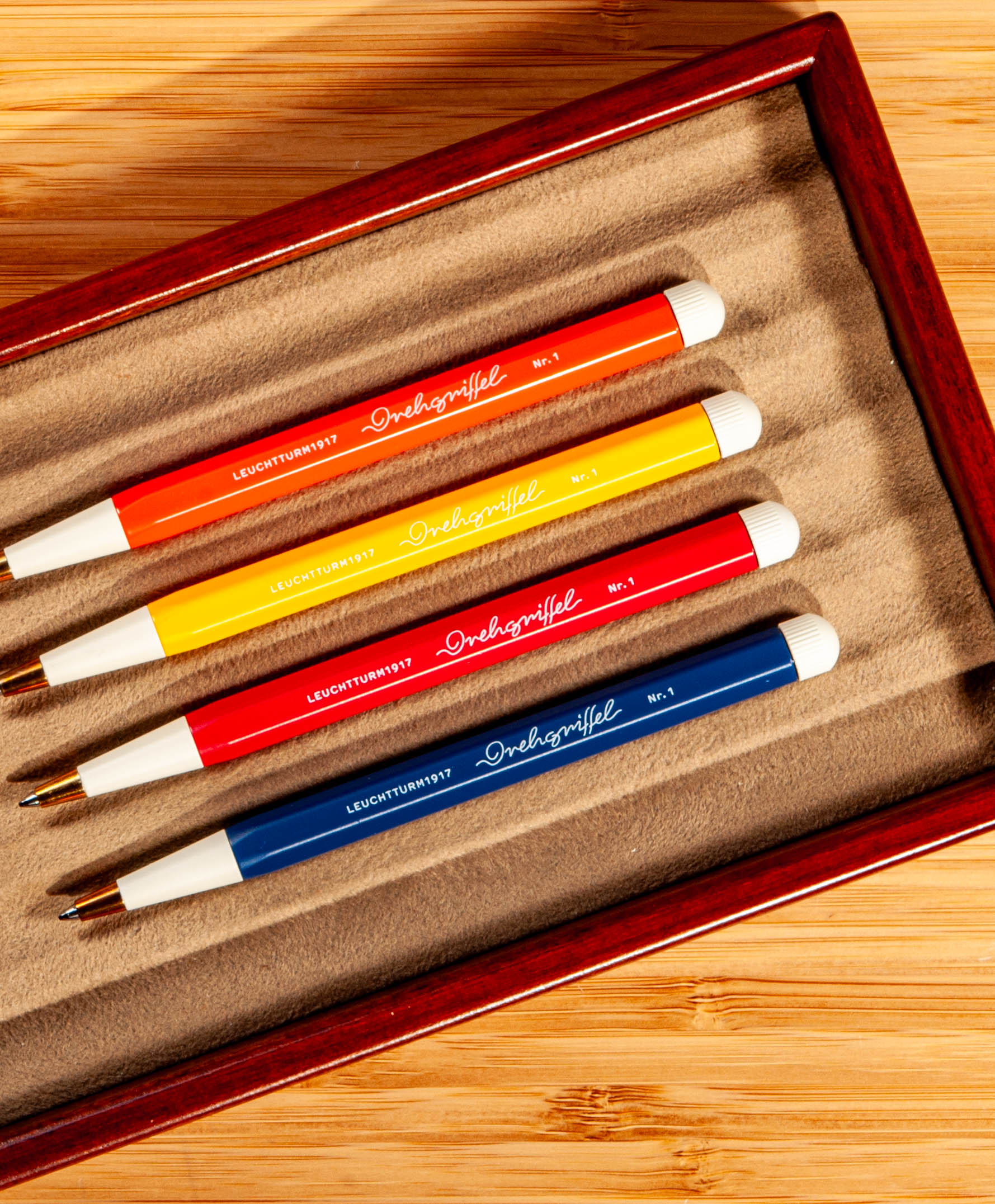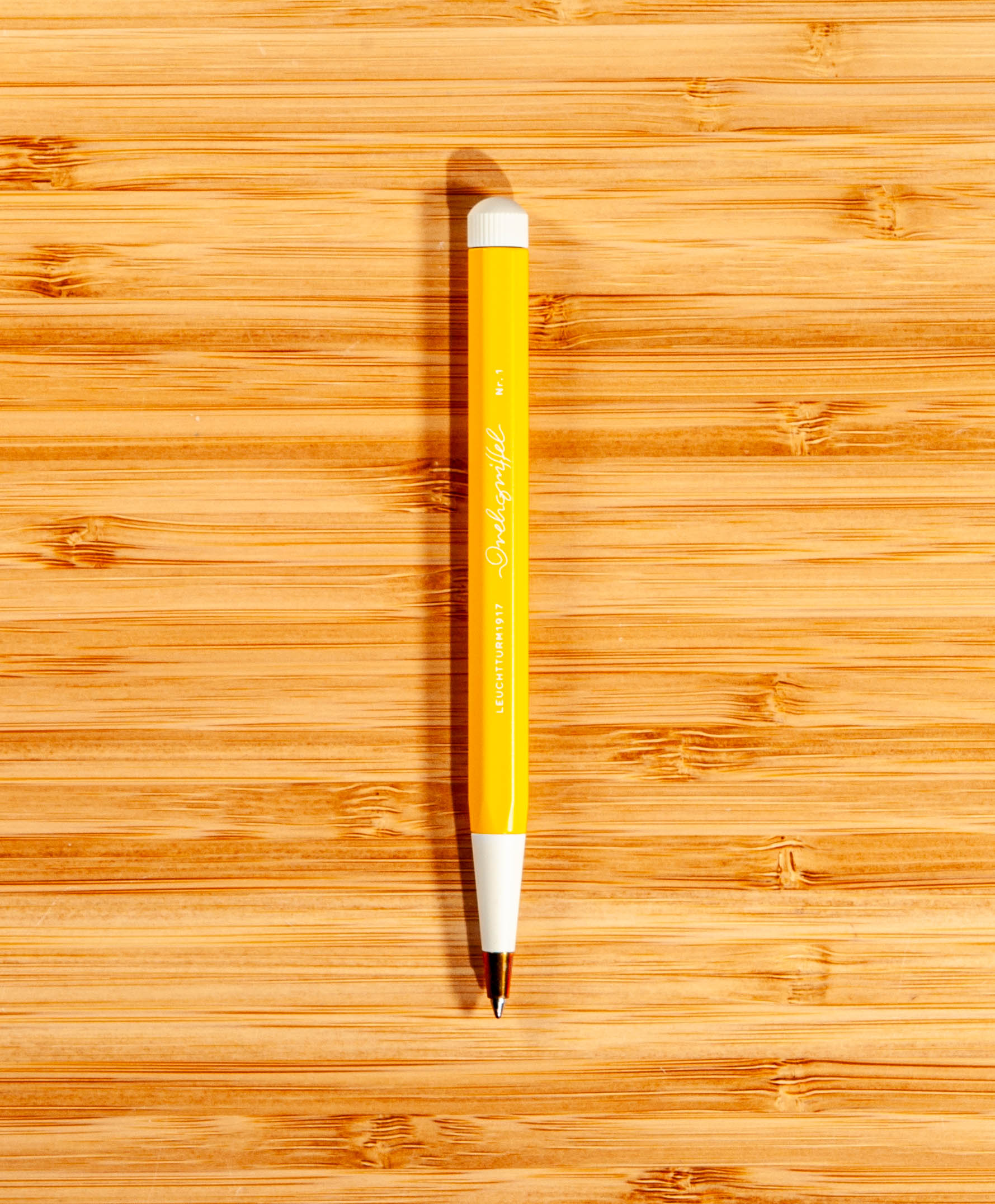 The Drehgriffel Nr. 1 makes a striking statement, with its hexagonal silhouette. Both the narrowly tapered tip and the twist mechanism come in a color that contrasts with the body.